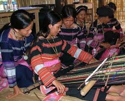 What draws the most attention from visitors about the tho camproduced by the Cham people from Ninh Thuan province are the two looms in one set which are distinctly different in their sizes, structures and weaving methods. The artisans at the high loom with coral pieces hung over it resemble artists playing musical instruments.